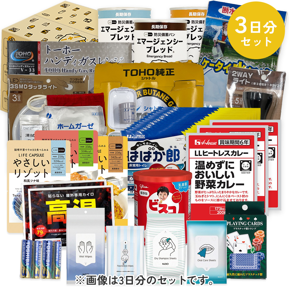 非常用トイレ、2WAYライト(単3乾電池1本タイプ)、3SMDタッチライト、単3電池(4本パック) 、TOHOガスコンロ V-33、プラテック 折りたたみ 水タンク15L PW-15、TOHO カセットガス(3本組)、オリジナルトランプ、ダンボール(備蓄品入)、LIFE CAPSULE 長期保存カイロ、エマージェンシーブレッド 7年保存 3食セット、あんぜん亭 3味セット、LLヒートレスカレー 3食セット、救急セット 巾着セット